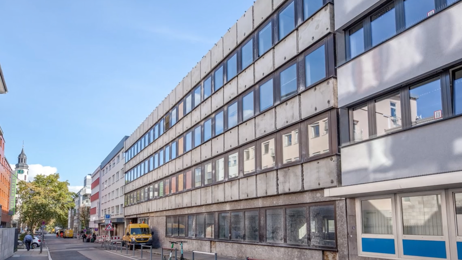 The ageing office building opposite the synagogue in the centre of Stuttgart's old town is in desperate need of renovation. Its appearance is detrimental to the overall appearance of the square.