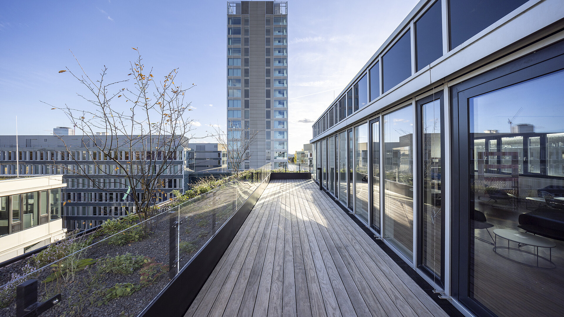 NEXUM's motto is: connect - inspire - grow. Modern working environments, where wellbeing and productivity go hand in hand, provide the ideal basis for creative work and sustainable growth. With well thought-out floor plans, modern and sustainable design, generous room heights, a new representative lobby and the Meet & Relax Area, the seven-storey NEXUM offers the ideal conditions for modern work environments with a feel-good factor for discerning companies. A sophisticated digitalisation concept makes life and work easier for users. For example, the recently launched NEXUM portal provides comprehensive mobility data on public transport, travel times and car-sharing options in the area. Access authorisations, room and parking bookings are organised via app or desktop, and quick contact with facility and property management or the owner is guaranteed. Future revitalisation plans include a large, wind-protected roof terrace with views of the skyline and new, high-quality outdoor areas with plenty of greenery to linger in.